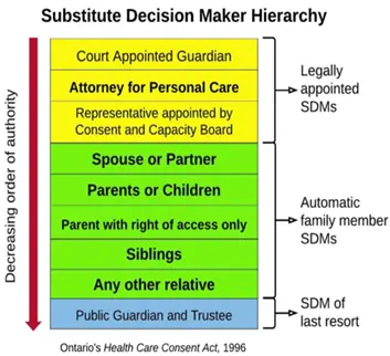 Having a Substitute Decision Maker (SDM) is automatic, usually family although you may appoint an Attorney for Personal Care. For those with no family or POA, the province of Ontario will appoint a SDM, but since it is impossible to have a conversation with someone who is not appointed until after one is no longer able to make his own decisions, being proactive and having the conversations sooner rather than later. It is also helpful to choose a SDM younger than yourself, because it is certainly possible that by the time they are needed, one’s peers could be unable or unwilling to act on your behalf. It is also important to select and individual or individuals who will accurately represent your faith and what is important to you.